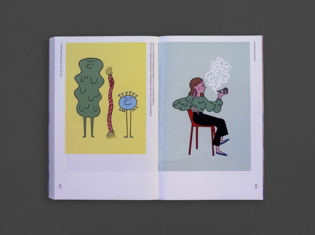 «A finales del año 2016, debido al progresivo deterioro de mi estado de salud y a la carencia de herramientas para afrontar y gestionar la enfermedad, decidí crear, desde las estrategias propias de las artes plásticas, un cuerpo de trabajo que me ayudase a mejorar mi relación con la fibrosis quística y a establecer protocolos que facilitasen la realización de sus tratamientos. Desarrollé Crepitantes, un proyecto desde el que analizarla enfermedad a través del dibujo de situaciones cotidianas y elementos representativos de esta patología: artefactos respiratorios, bacterias y microbios, y el fenómeno más característico de esta enfermedad: el moco. Las ilustraciones resultantes de estos cuestionamientos y exploraciones adoptaron forma de cuenta de Instagram, en la que recopilaba las distintas ilustraciones de este nuevo imaginario creado en torno a la enfermedad crónica que padezco y que entonces rechazaba«. M. Elisa González García